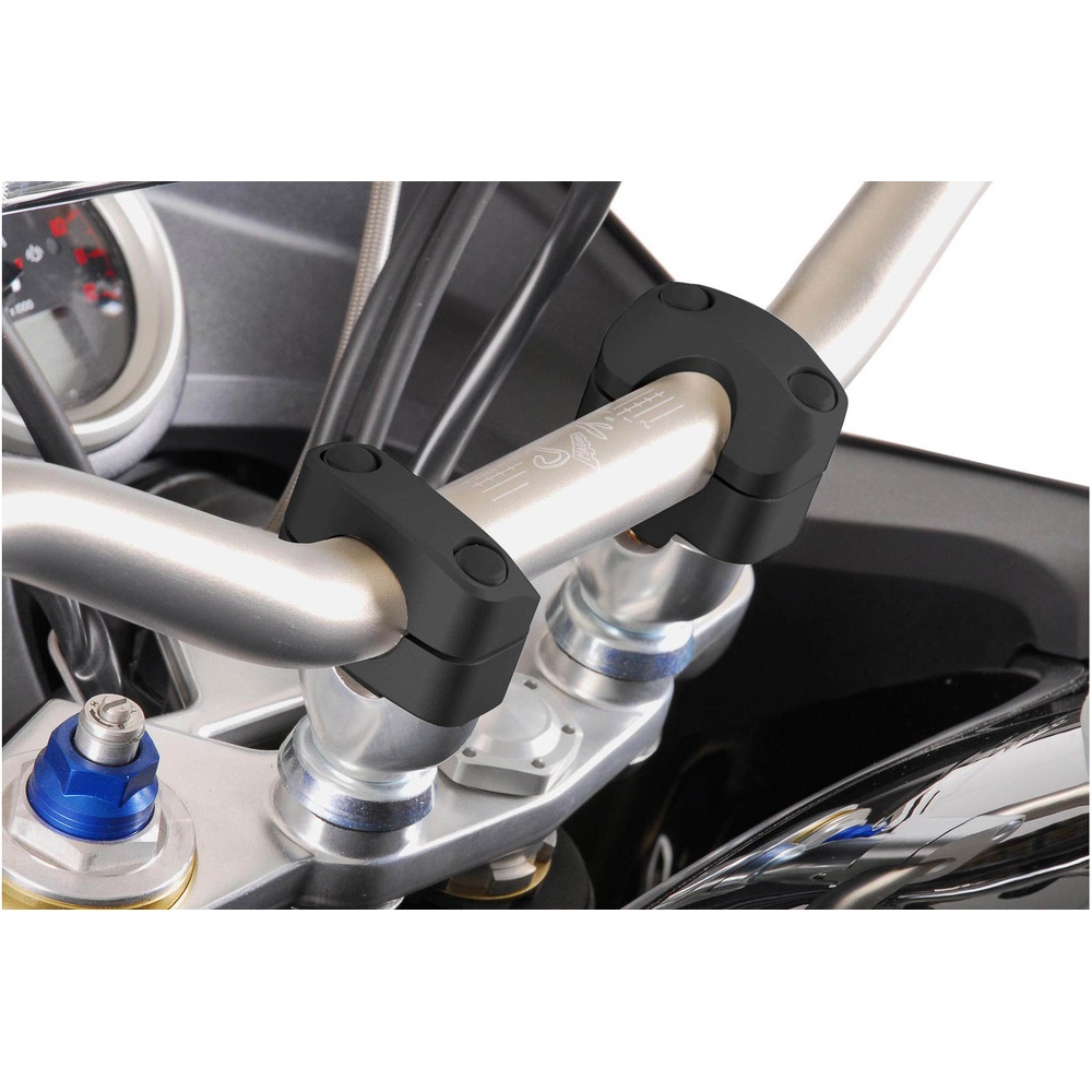 La conversione manubrio consente il montaggio di un manubrio da 28 mm su un sostegno per manubri da 22 mm. Allo stesso tempo, con un aumento di 20 mm, le conversioni offrono un vantaggio nel comfort di guida. Tutte le conversioni manubrio sono in lega di alluminio ad alta resistenza, sono lavorate a fresatura CNC e presentano una distanza tra i fori di 30-37 mm.