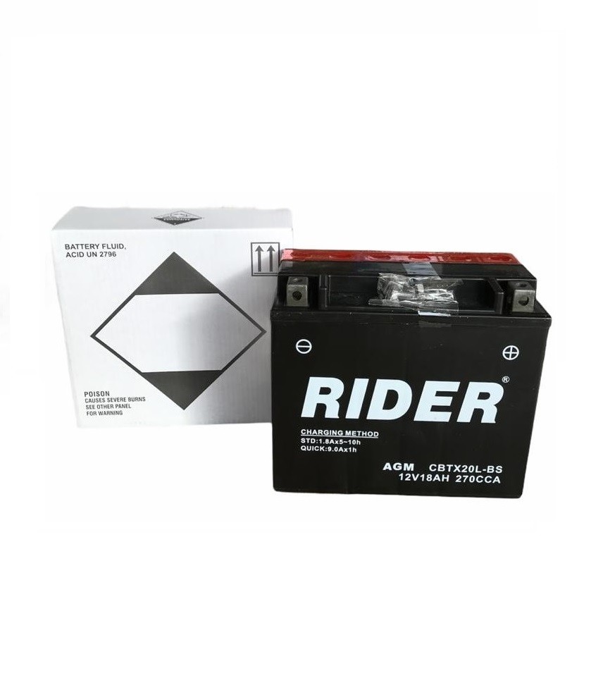 Le Batterie Rider serie MF (senza manutenzione) sono costruite con una lega di piombo e calcio che, sfruttando la tecnologia AGM, non necessitano di alcuna manutenzione: niente perdite, niente fughe, niente acido, garantendo sempre elevato amperaggio e massima tenuta del picco di carica. Inoltre, i separatori di fibre di vetro e l'alta concentrazione di celle aumentano la vita della batteria e neutralizzano i problemi dovuti alle alte vibrazioni del veicolo. Al fine di avere le massime performance della batteria al momento dell'installazione sul veicolo, nella confezione è presente la batteria e il contenitore con l'acido necessario al suo funzionamento. La vita della batteria infatti ha inizio dal momento in cui viene inserito l'acido all'interno della stessa. Rider è un marchio Unibat; garantisce quindi un prodotto eccellente ad un prezzo più accessibile.