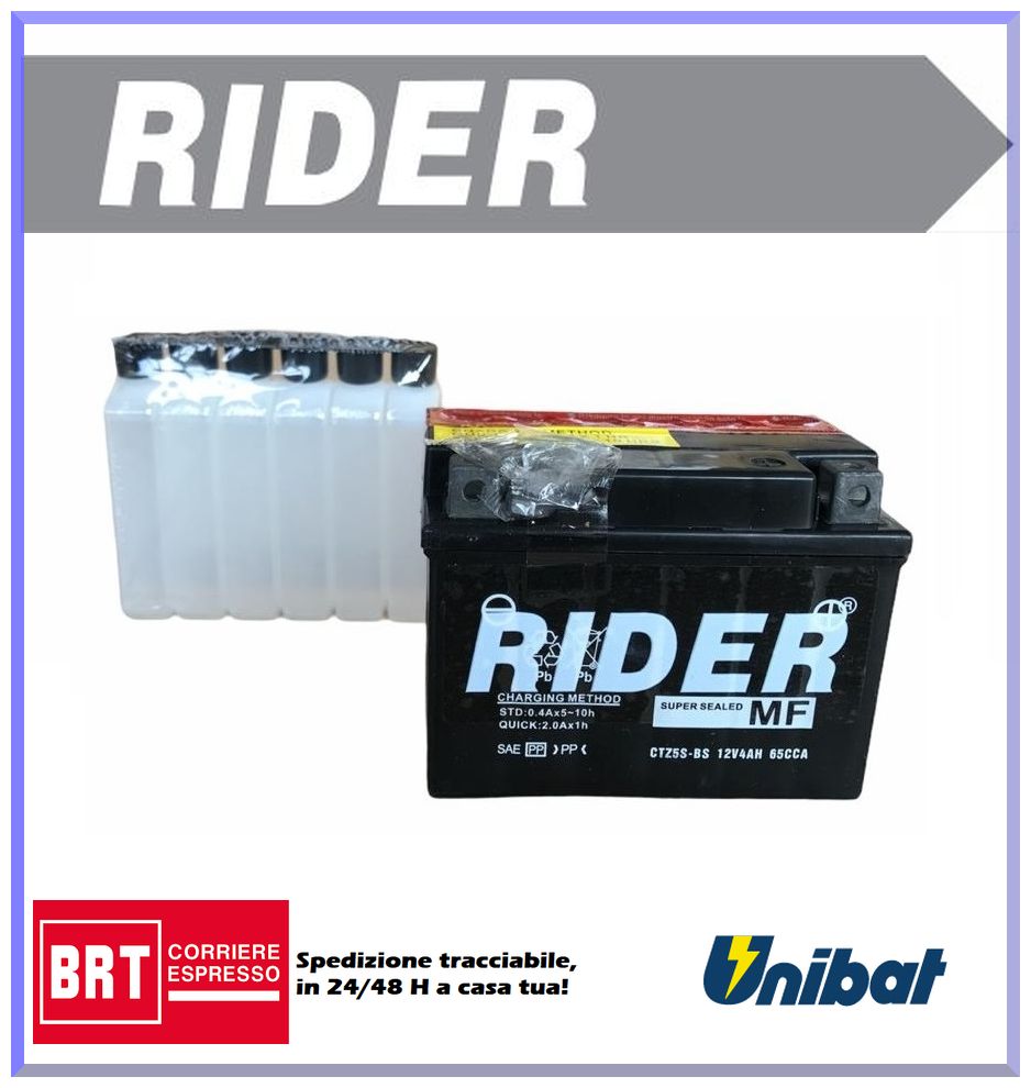 Batteria Rider CTZ5SBS serie MF (senza manutenzione), tecnologia AGM, con acido a corredo, per HONDA C Super Cub 125cc 2019-2019 (Yuasa code YTZ5S)Le Batterie Rider serie MF (senza manutenzione) sono costruite con una lega di piombo e calcio che, sfruttando la tecnologia AGM, non necessitano di alcuna manutenzione: niente perdite, niente fughe, niente acido, garantendo sempre elevato amperaggio e massima tenuta del picco di carica. Inoltre, i separatori di fibre di vetro e l’alta concentrazione di celle aumentano la vita della batteria e neutralizzano i problemi dovuti alle alte vibrazioni del veicolo. Al fine di avere le massime performance della batteria al momento dell’installazione sul veicolo, nella confezione è presente la batteria e il contenitore con l’acido necessario al suo funzionamento. La vita della batteria infatti ha inizio dal momento in cui viene inserito l’acido all’interno della stessa.