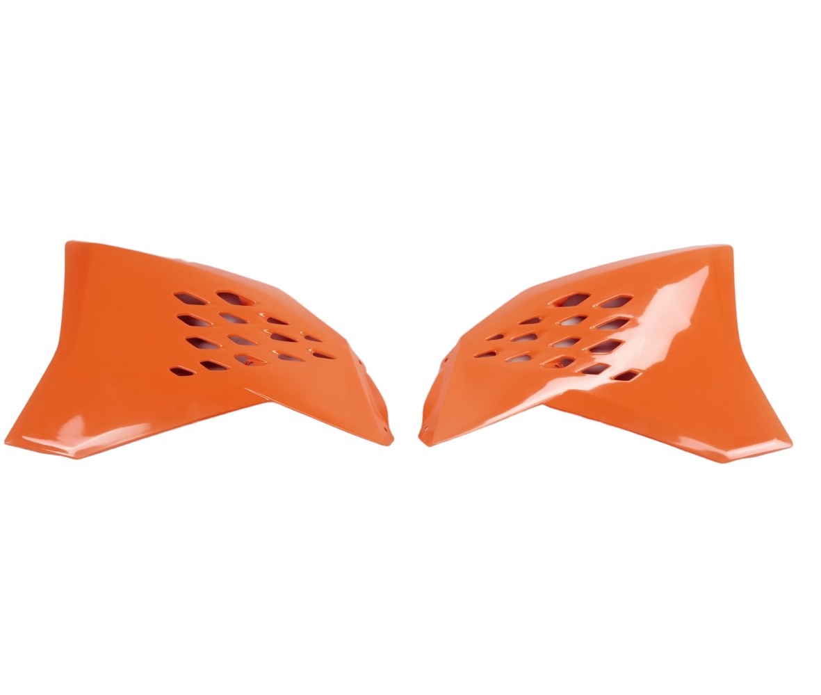 Questi convogliatori arancioni per KTM 450 EXC-F hanno una doppia funzione: migliorano l’aspetto della moto e, allo stesso tempo, guidano correttamente il flusso d’aria verso i radiatori, aiutando a mantenere la giusta temperatura del motore. Se sei interessato a questo prodotto e vuoi conoscere la compatibilità anno moto fai riferimento al titolo del prodotto.