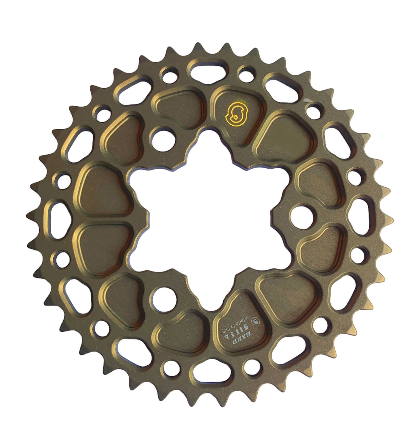 Passo 415 Materiale ERGAL made in Italy, con trattamento di ossidazione dura Interasse fori 69 mm. Diametro foro centrale 54 mm. Numero denti 38