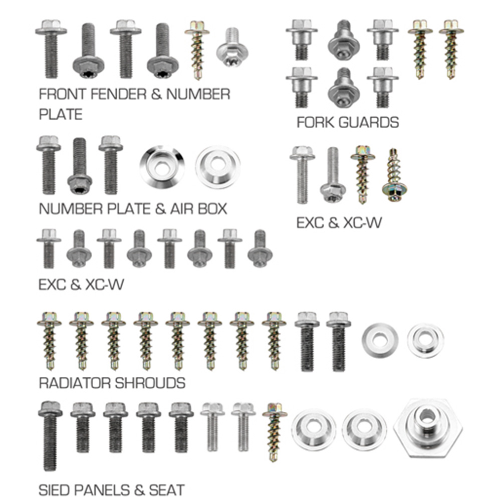 Questo kit viti è compatibile con KTM 350 SX-F. Per la compatibilità anno moto, far riferimento al titolo del prodotto. Verifica sempre la compatibilità con il tuo modello specifico prima dell’acquisto. Il kit è progettato per adattarsi perfettamente a plastiche originali o aftermarket, offrendo un fissaggio preciso e sicuro.