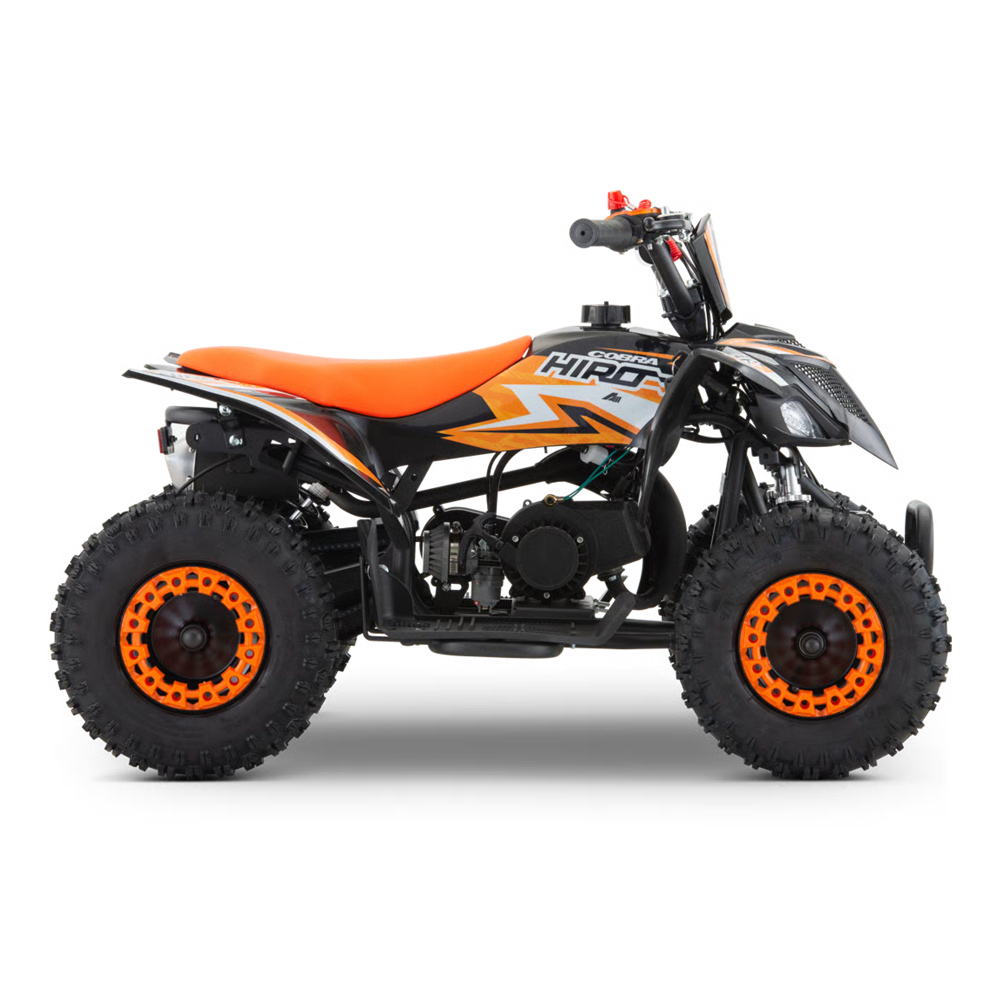 Il Miniquad Hiro Cobra 50cc Arancione è progettato per bambini dai 3 agli 8 anni che vogliono avvicinarsi alla guida in modo sicuro. Dotato di un motore 2 tempi da 49 cc con avviamento facilitato e frizione a due molle, offre prestazioni fluide e stabili fin dai primi utilizzi. Il lanciatore rinforzato in alluminio garantisce durata nel tempo, mentre la posizione dell'acceleratore è pensata per mani piccole, evitando sforzi inutili. Il design grafico e tecnico è stato sviluppato da Apollo Motors, marchio francese specializzato nel settore junior offroad.
