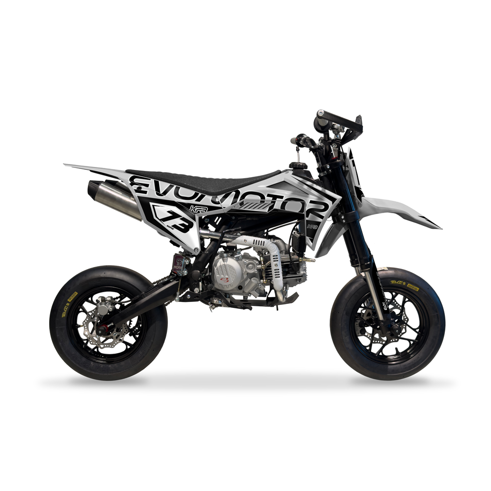 La nuova KF3 Pro, firmata Evomotor, si distingue dalle altre Pit Bike in commercio per la qualità e la cura nei dettagli. È equipaggiata con una forcella anteriore completamente regolabile, che permette di intervenire facilmente sulla compressione e sul ritorno grazie a un pratico pomello rapido. Al posteriore troviamo un monoammortizzatore DNM MTG con regolazione del precarico della molla, della compressione e del ritorno idraulico, per un assetto sempre perfetto in ogni condizione. Il nuovo telaio perimetrale assicura stabilità, precisione e maneggevolezza, caratteristiche ideali per chi vuole portare la moto al limite, sia in pista che in off-road. Completano il quadro le nuove plastiche dal design racing, che donano alla KF3 Pro un look aggressivo e moderno. Robustezza, agilità e leggerezza: queste le tre parole chiave che descrivono la nuova KF3 Pro, pensata per chi cerca prestazioni e affidabilità in un’unica moto. Servizio esclusivo Evomotor, forniamo la moto direttamente con grafica stampata personalizzata con vostro nome e numero.
