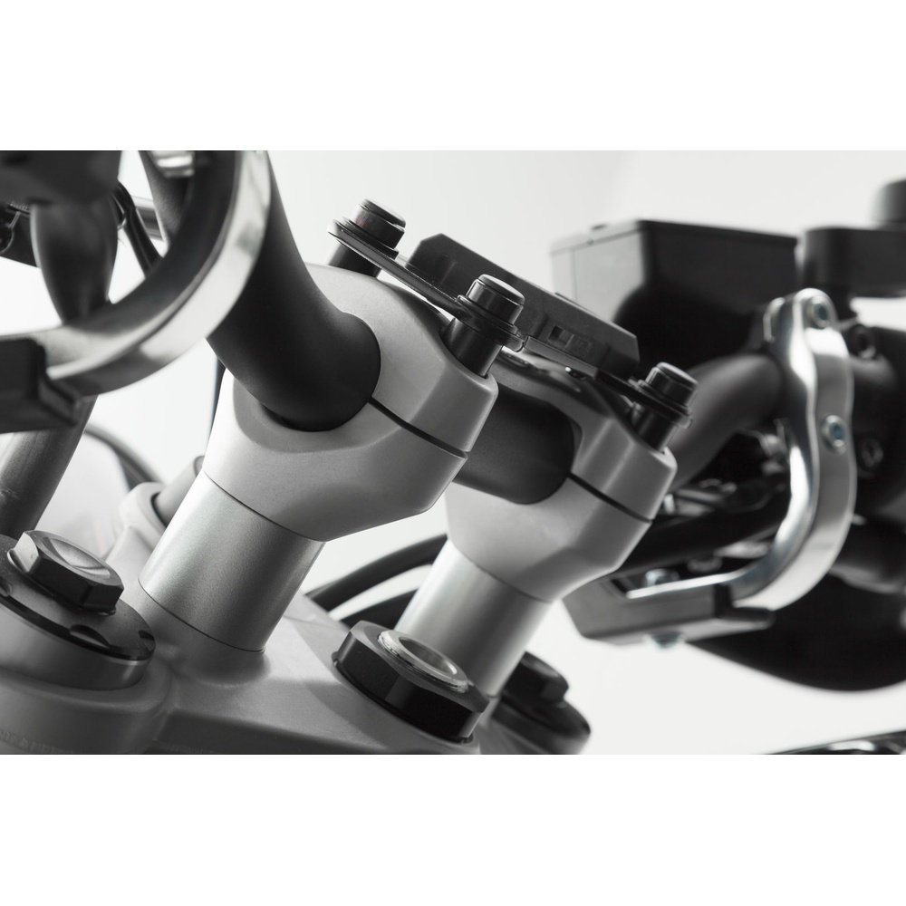 I riser manubrio realizzati in pregiata lega di alluminio spostano il manubrio di 20 mm verso l'alto e garantiscono un comfort di guida sensibilmente maggiore. Non è necessario allungare i cavi dei comandi e dei freni