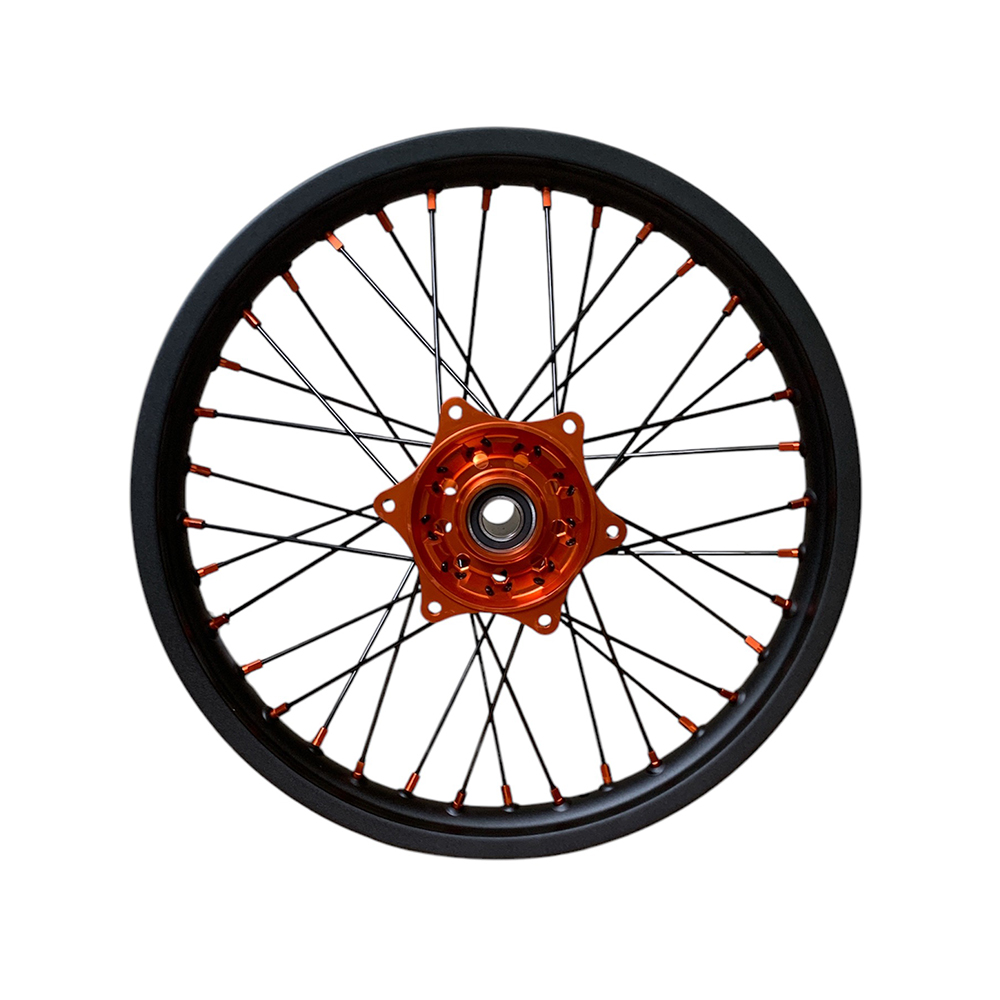 Il cerchio è in alluminio anodizzato, leggero e resistente. Il colore brillante aggiunge un tocco sportivo ed elegante alla moto. I raggi rinforzati garantiscono un'elevata resistenza, anche in caso di forti sollecitazioni o salti. Il mozzo è lavorato CNC, ovvero ricavato da un blocco solido di alluminio con macchinari di alta precisione. Questo assicura durata, stabilità e perfetto allineamento. La ruota è già assemblata con cuscinetti e distanziali, pronta al montaggio. Il bilanciamento è ottimale e la struttura è pensata per durare nel tempo, anche in condizioni difficili.