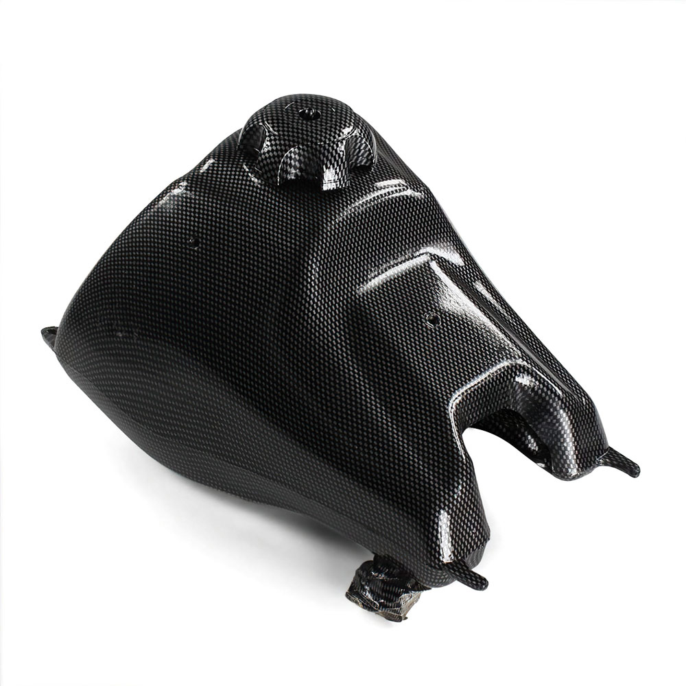 Serbatoio benzina per pitbike con plastiche CRF 70 con finitura in effetto carbonio. Modello con rubinetto benzina installato direttamente su serbatoio.