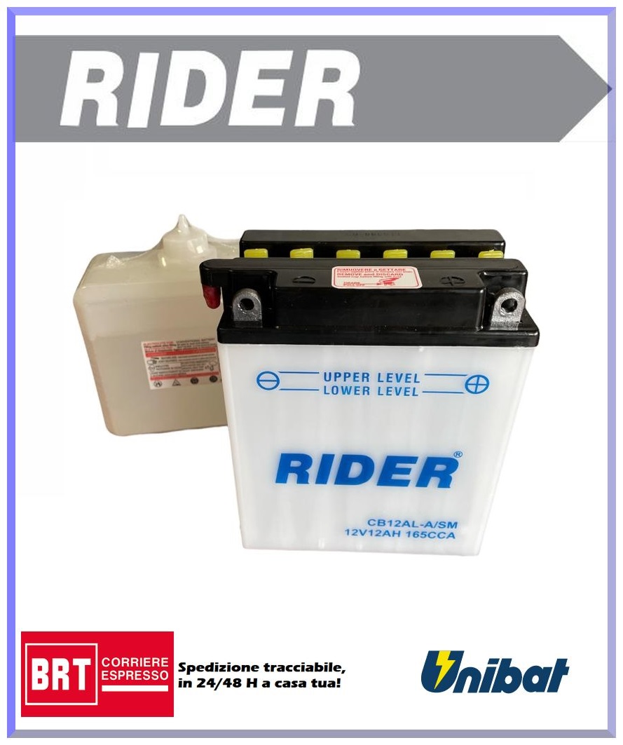 Batteria Rider CB12ALASM HONDA CB N DX (PC14) 450cc 1989-1992 (Yuasa code YB12AL-A2)Le Batterie Rider Serie Convenzionali sono progettate per sfruttare la combinazione del piombo e dell’ acido e ottenere sempre ottime performance in avviamento e garantire un alto amperaggio. Sono dotate di valvola di scarico per consentire un normale deflusso dell’elettrolita in condizioni particolarmente gravose. La scatola trasparente rende semplice il monitoraggio dei livelli degli elettroliti per consentire un’ agevole manutenzione. Al fine di avere le massime performance della batteria al momento dell’installazione sul veicolo, nella confezione è presente la batteria e il contenitore con l’acido necessario al suo funzionamento. La vita della batteria infatti ha inizio dal momento in cui viene inserito l’acido all’interno della stessa.