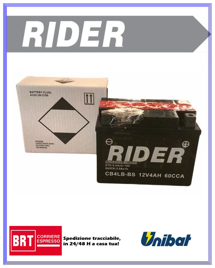 Batteria Rider CB4LBBS serie MF (senza manutenzione), tecnologia AGM, con acido a corredo, per APRILIA Sonic 50cc 1998-2007 ( Yuasa code YB4L-B)