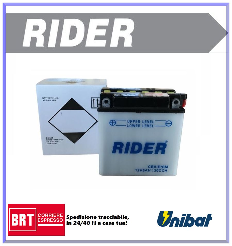 Batteria Rider CB9BSM serie Convenzionale, con acido a corredo, per GILERA RX Arizona 200cc 1985-1987 (Yuasa code YB9-B)Le Batterie Rider Serie Convenzionali sono progettate per sfruttare la combinazione del piombo e dell’ acido e ottenere sempre ottime performance in avviamento e garantire un alto amperaggio. Sono dotate di valvola di scarico per consentire un normale deflusso dell’elettrolita in condizioni particolarmente gravose. La scatola trasparente rende semplice il monitoraggio dei livelli degli elettroliti per consentire un’ agevole manutenzione. Al fine di avere le massime performance della batteria al momento dell’installazione sul veicolo, nella confezione è presente la batteria e il contenitore con l’acido necessario al suo funzionamento. La vita della batteria infatti ha inizio dal momento in cui viene inserito l’acido all’interno della stessa.