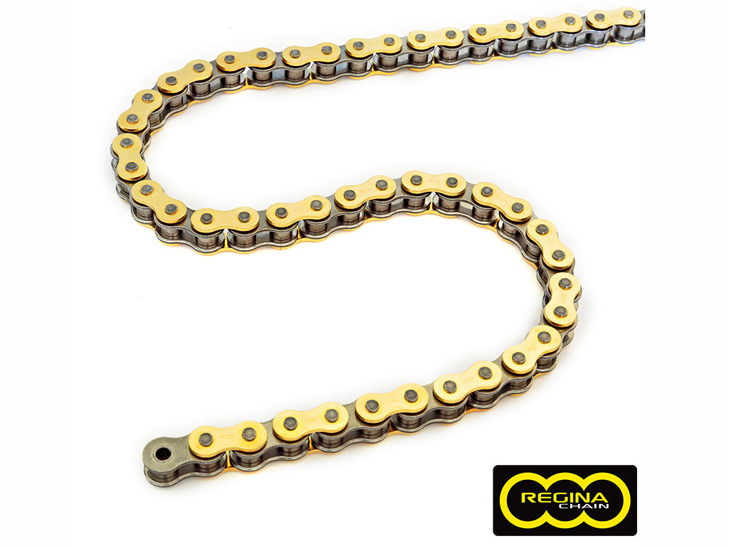 Catena REGINA passo 428 lunghezza 136 maglie versione RX professionale dispongono di speciali perni cromati di tipo “X”. Le Boccole lunghe, cilindri senza saldatura pallinati e piastre in acciaio assicurano una maggiore durata. I modelli 428RX3 e 520RX3 hanno piastrine esterne dotate di una speciale smussatura che consente un migliore inserimento in pignone e corona in condizioni difficili