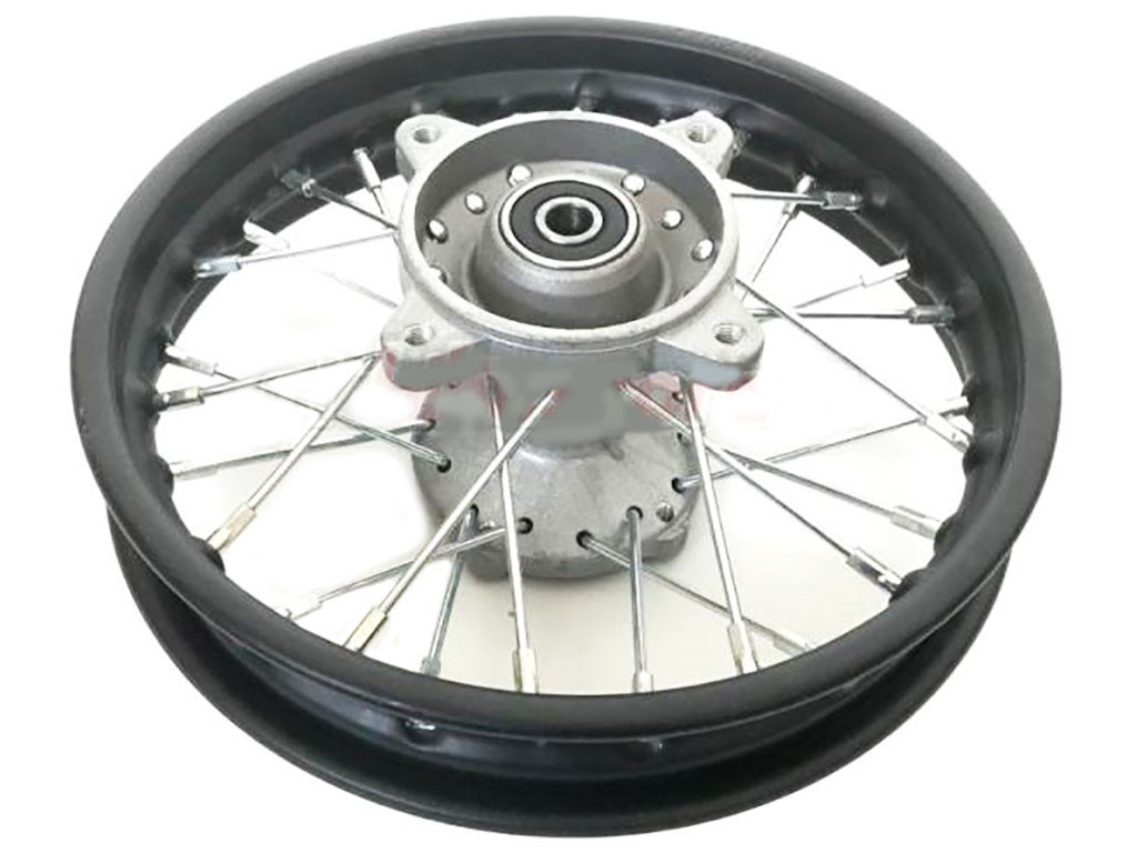 Per minicross 2 tempi. Foro perno ruota da 12mm. Alloggiamento disco freno 72mm, interasse (diagonale) fori attacco disco freno 85mm. Alloggiamento corona 90mm, interasse (diagonale) fori attacco corona 110mm.