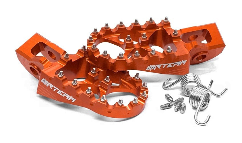 Coppia pedane in ergal maggiorate ricavate dal pieno, con puntali avvitati ultra resistenti, per KTM 150 SX arancioni.