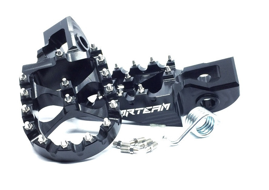 Coppia pedane in ergal maggiorate ricavate dal pieno, con puntali avvitati ultra resistenti, per KTM 85 SX nere.