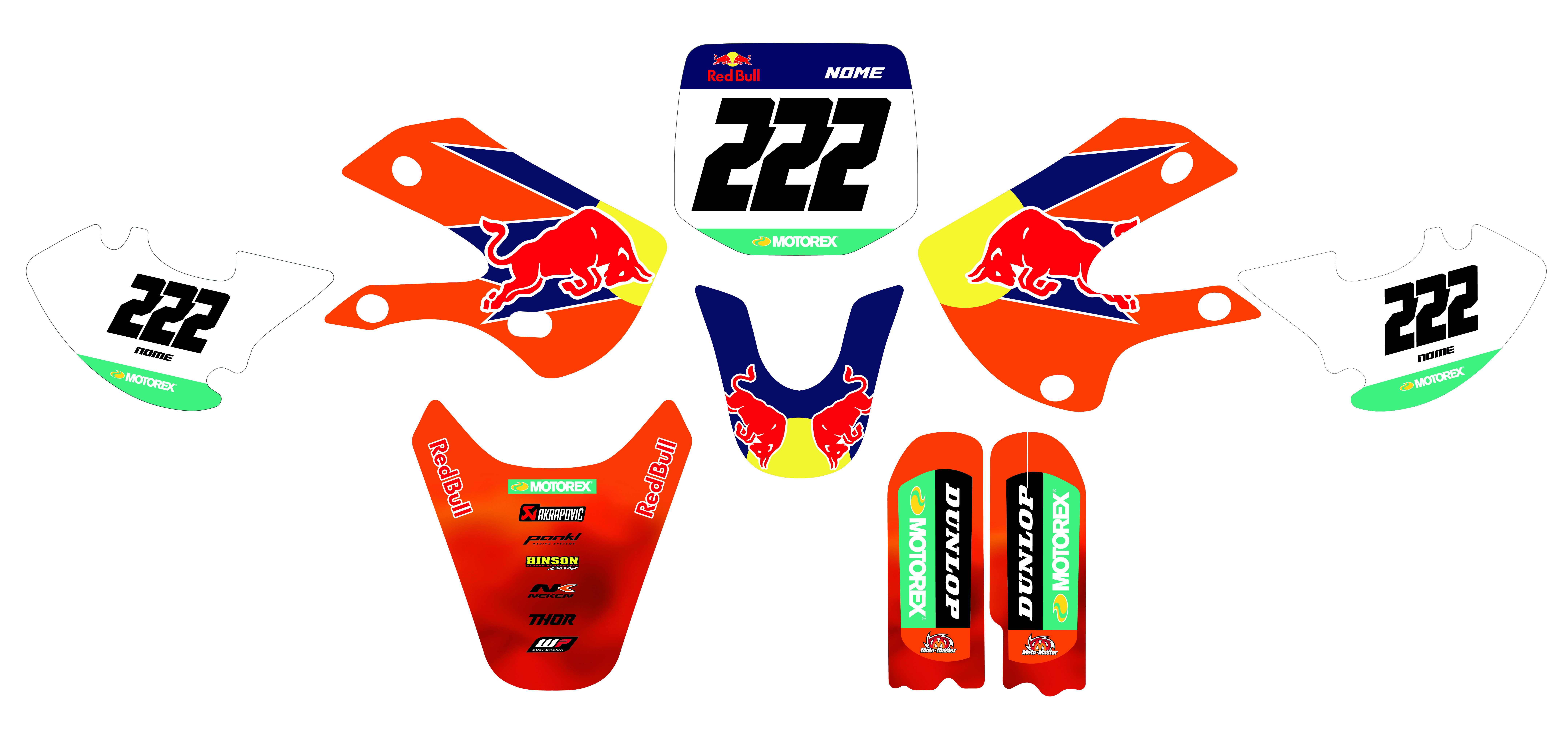 Per questo kit utilizziamo solo materiali professionali di altissima qualità, resistenti all’usura e agli agenti atmosferici. Il rivestimento è in crystal da 300 micron, un materiale spesso e protettivo, capace di proteggere la grafica da graffi, abrasioni e raggi UV. Il risultato è una finitura lucida e duratura, perfetta per un utilizzo sportivo o intensivo. Inoltre, hai la possibilità di personalizzare la tua grafica con nome e numero gara, rendendo la tua moto unica e riconoscibile in pista o nel paddock. Un’opzione ideale per team, piloti amatori o chi semplicemente vuole distinguersi con stile.