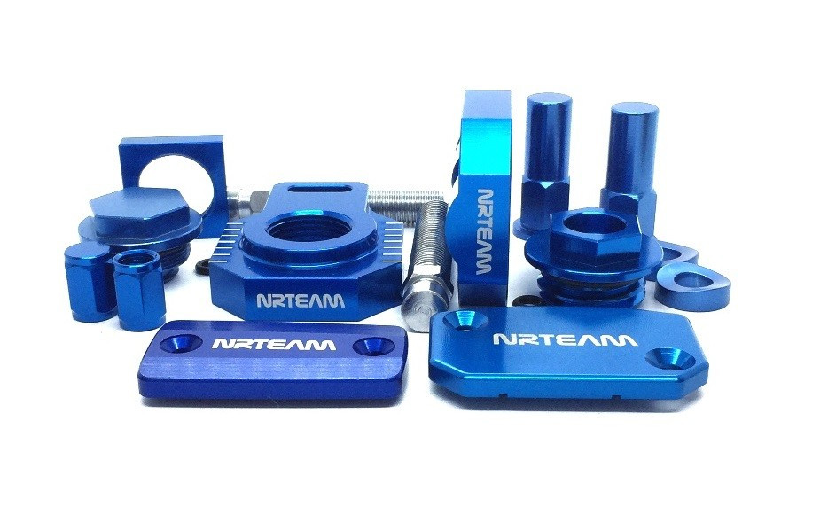 Contenuto kit: tappo carter motore, registri tendicatena racing, coperchio freno anteriore e posteriore, coperchio pompa frizione, tappi valvola copertone, dadi fermacopertone