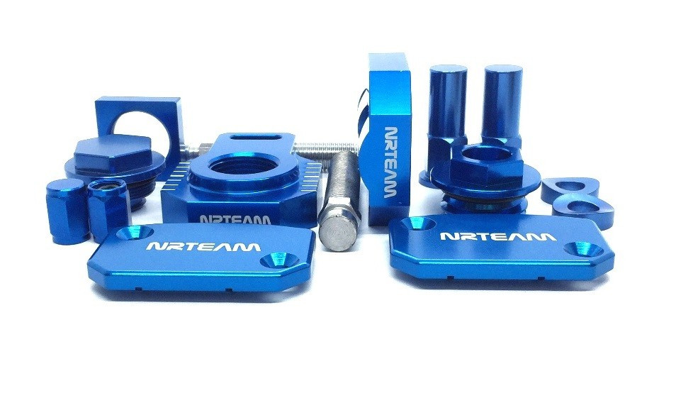 Contenuto kit: tappo carter motore, registri tendicatena racing, coperchio freno anteriore e posteriore, coperchio pompa frizione, tappi valvola copertone, dadi fermacopertone