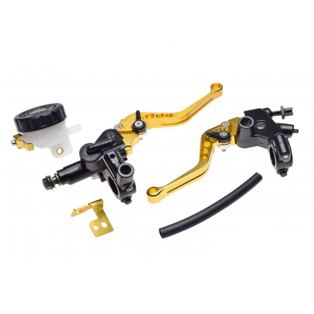 I componenti sono realizzati con lavorazione CNC, che garantisce precisione e robustezza. Il colore oro dona alla moto un look più moderno e aggressivo. La leva frizione è leggera ma resistente, facile da usare anche nelle situazioni di guida più intense. La pompa freno assicura una frenata stabile e progressiva, migliorando il controllo della moto.