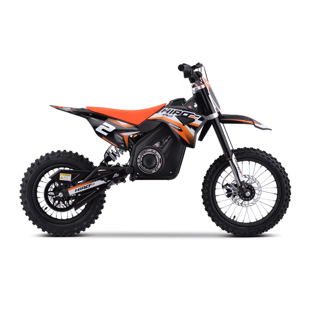 La minicross elettrica Hiro Rocket di colore arancione da 1300 Watt rappresenta un’ ottima scelta per i giovani piloti alle prime esperienze fuoristrada. Pensata per bambini dai 7 ai 12 anni, questa moto è il risultato di oltre 15 anni di sviluppo nel settore da parte di Apollo Motors. Il modello si distingue per leggerezza, maneggevolezza e solidità, con un design moderno e componenti tecnici di alta qualità. È dotata di un potente motore elettrico brushless da 1300W, accoppiato a una batteria al litio da 48V 13Ah, che assicura un'autonomia fino a circa 90 minuti di utilizzo continuo. La configurazione con ruota anteriore da 14” e posteriore da 12” migliora la stabilità e la capacità di affrontare terreni irregolari.