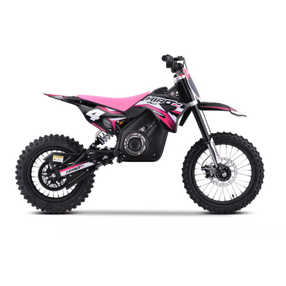La minicross elettrica Hiro Rocket di colore rosa da 1300 Watt rappresenta un’ ottima scelta per i giovani piloti alle prime esperienze fuoristrada. Pensata per bambini dai 7 ai 12 anni, questa moto è il risultato di oltre 15 anni di sviluppo nel settore da parte di Apollo Motors. Il modello si distingue per leggerezza, maneggevolezza e solidità, con un design moderno e componenti tecnici di alta qualità. È dotata di un potente motore elettrico brushless da 1300W, accoppiato a una batteria al litio da 48V 13Ah, che assicura un'autonomia fino a circa 90 minuti di utilizzo continuo. La configurazione con ruota anteriore da 14” e posteriore da 12” migliora la stabilità e la capacità di affrontare terreni irregolari.