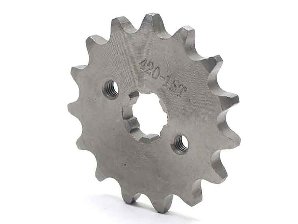 Pignone 15 denti, passo 420. Foro centrale 20 mm. Interasse fori fissaggio 35 mm. Compatibile con tutti i motori con albero di diametro 20mm.