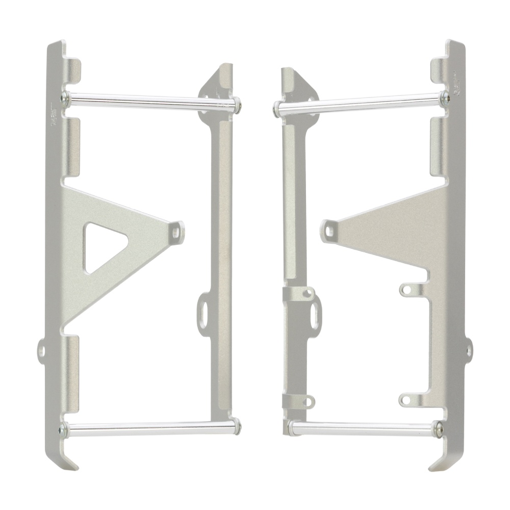 I proteggi radiatori CrossPro sono realizzati con leghe di alluminio di altissima qualità, scelte per garantire durata e leggerezza. Lo spessore del materiale è di 3 mm, un valore che assicura rigidità e resistenza meccanica superiore rispetto ad altre soluzioni presenti sul mercato. I collegamenti sono rinforzati da tubi pieni, che irrigidiscono la struttura e la rendono stabile anche sotto forti sollecitazioni. Un altro vantaggio importante è la disposizione dei punti di fissaggio: non sono a contatto diretto con il radiatore, caratteristica che aumenta la capacità di assorbire urti e impatti. Inoltre, queste protezioni permettono di mantenere la protezione plastica di serie già montata sulla moto. Disponibili esclusivamente in colorazione alluminio con finitura sabbiata, si integrano perfettamente con l’estetica del mezzo e mantengono un aspetto sobrio e resistente nel tempo.